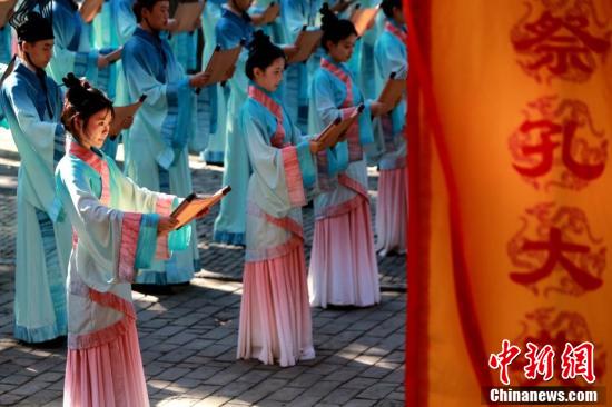 9月28日,甲辰年公祭孔子大典在山东曲阜孔庙举行,海内外各界嘉宾汇聚于此,共同纪念孔子诞辰2575年。图为青年学生在孔庙齐声诵读儒学经典。