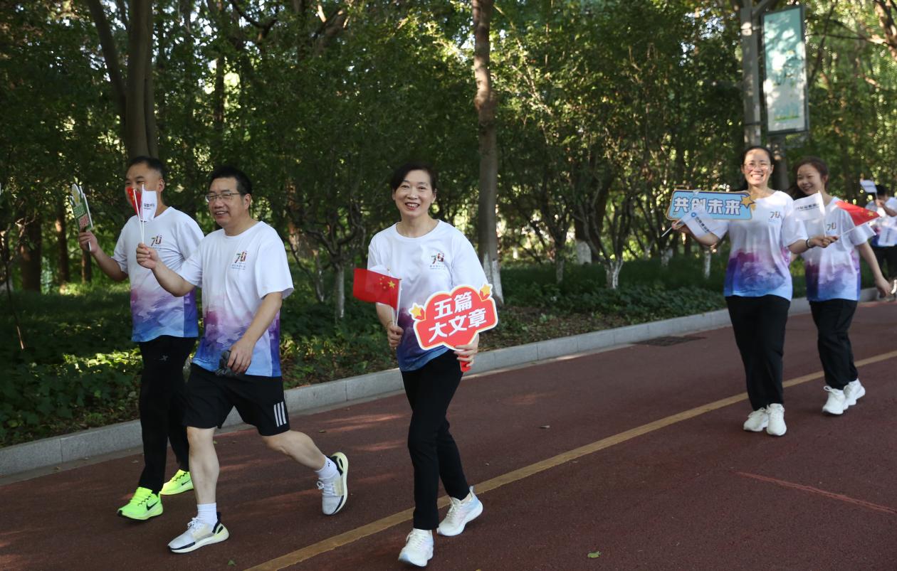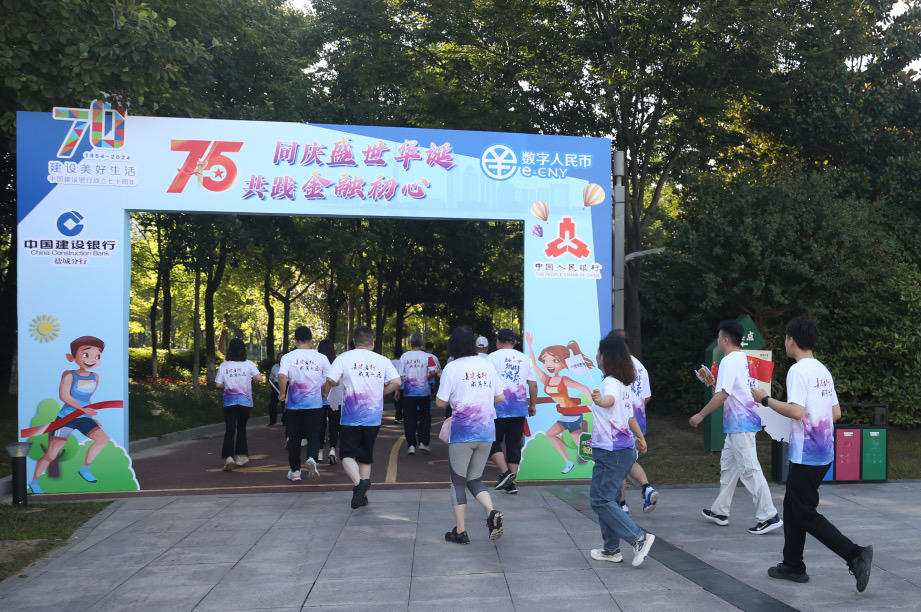 新华报业网讯 九月金秋,大地苍劲,万物丰盈。为庆祝中华人民共和国成立75周年,深入践行“金融为民”理念,扎实做好“五篇大文章”,助力金融强国建设与金融高质量发展,同时庆祝建设银行成立70周年,丰富结对共建成果,普及金融与消保知识,9月28日上午,建行盐城分行与中国人民银行盐城市分行联合举办“同庆盛世华诞 共践金融初心”健步走宣传活动。本次活动来自两家单位的超过200名员工组成了一支充满活力的队伍,身着统一的文化衫,手持国旗与宣传标语,在盐渎公园内进行轻松愉快的健步行进。