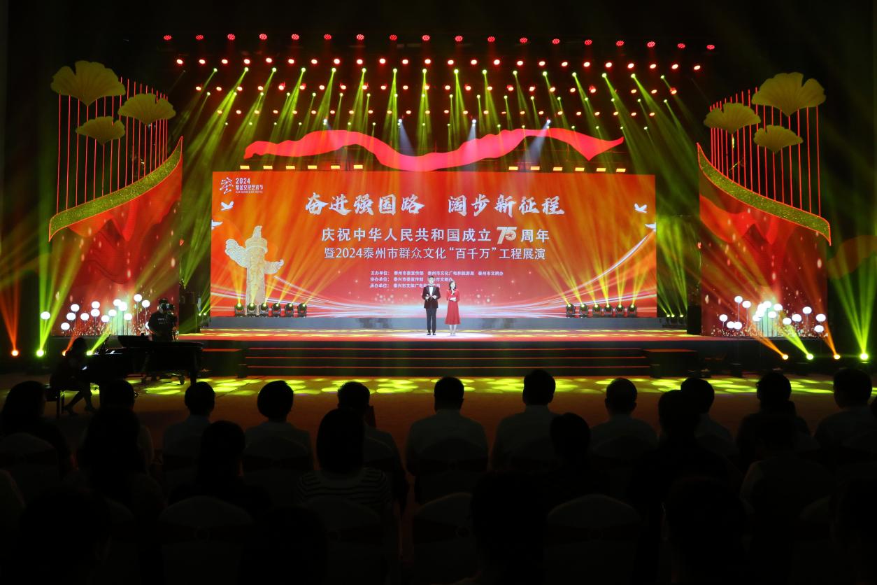 “今天是你的生日我的中国,清晨我放飞一群白鸽……”9月29日上午,在清澈透亮的童声合唱中,庆祝中华人民共和国成立75周年暨2024泰州市群众文化“百千万”工程展演活动在泰兴市体育馆拉开帷幕。