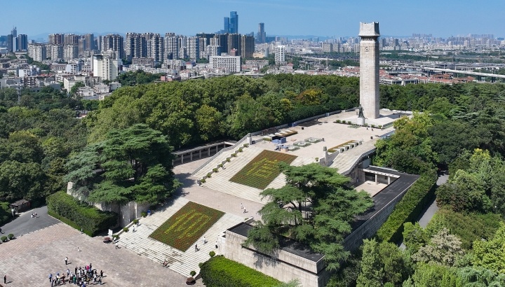 南京雨花台烈士纪念碑前,数万盆鲜花组成“信仰”字样,缅怀革命先烈