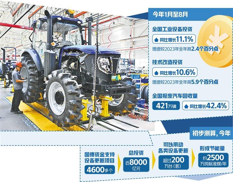 我国出台加力支持大规模设备更新和消费品以旧换新(以下简称“两新”)的若干措施后,支持大规模设备更新的1500亿元超长期特别国债资金,已分两批全部安排到项目。初步测算,今年国债资金支持4600多个设备更新项目,总投资近8000亿元,可以带动各类设备更新超200万台(套),形成节能量约2500万吨标准煤/年。