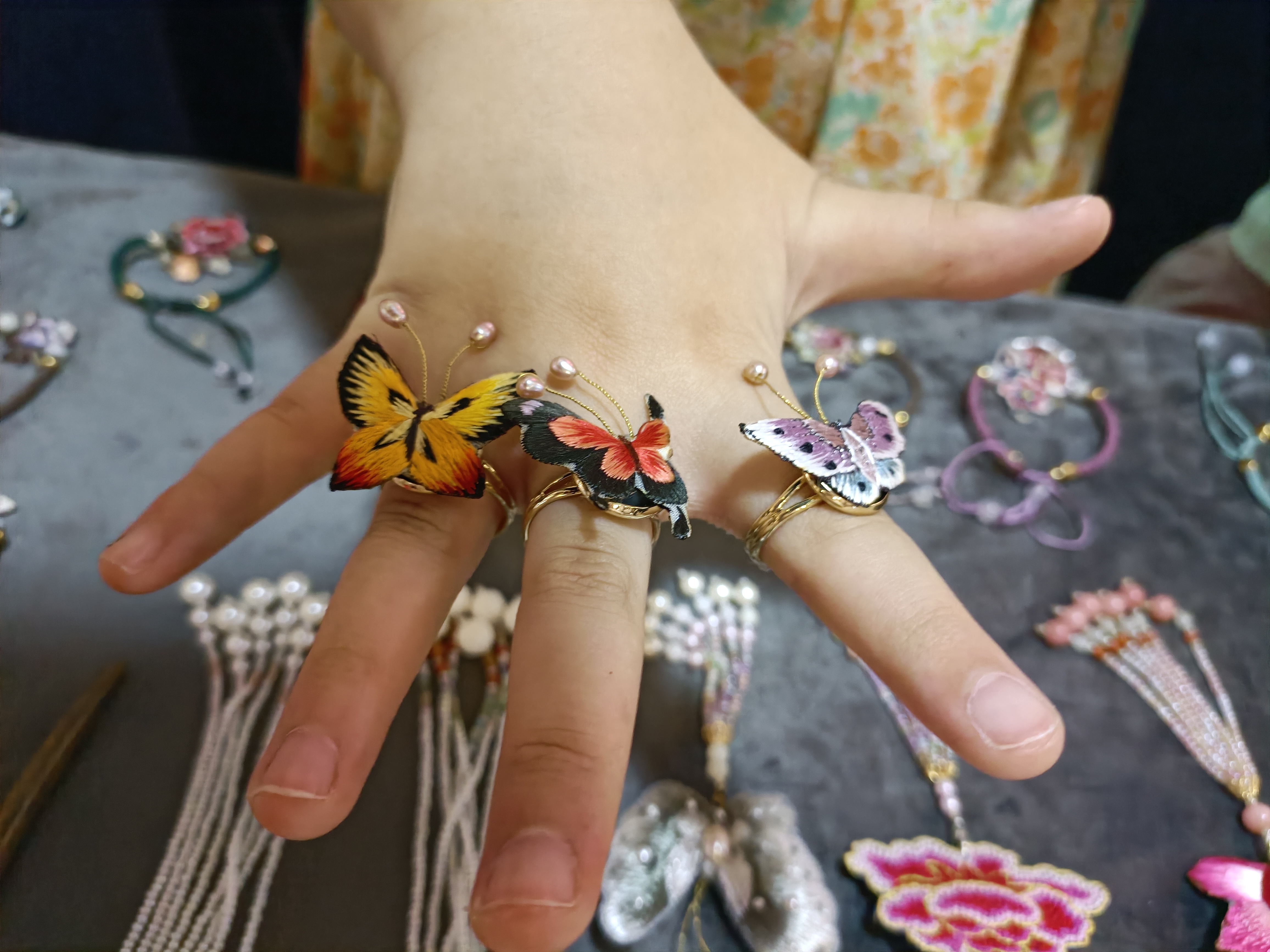 高瑞雷介绍,在大多人的印象中,刺绣作品多是平面的。而立体刺绣戒指是在传统手工刺绣工艺基础上,采用套针、回针及滚针的针法,中间再加入卷好的中药香草,从而绣成独特的蝴蝶、花朵。不仅具有了立体感,而且带有淡淡的清香味。同时,戒指的指环用了K14电镀金,可大可小,不会氧化,不会褪色;手链上加入了珍珠、玛瑙和石榴石。当绣有这样刺绣的手链、戒指戴在手上,不仅体现传统工艺的精湛,也能表现出新时代刺绣时尚之美。