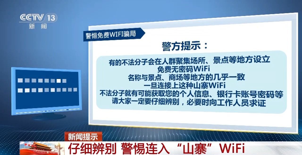 警方提示:有的不法分子会在人群聚集场所、景点等地方设立免费无密码Wi-Fi,名称与景点、商场等地方的几乎一致,一旦连接上这种山寨Wi-Fi,不法分子就有可能获取您的个人信息、银行卡账号密码等,请大家一定要仔细辨别,必要时向工作人员求证。