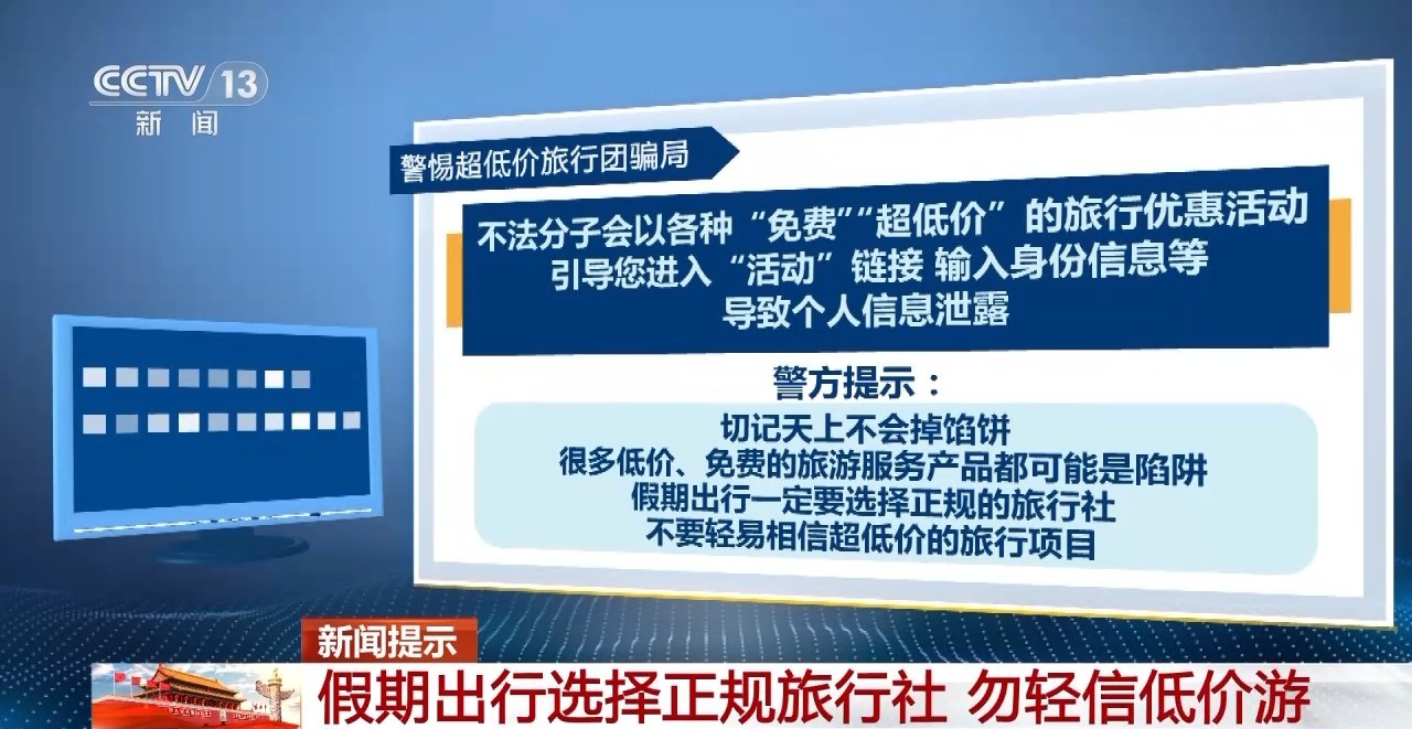 警方提示:切记天上不会掉馅饼,很多低价、免费的旅游服务产品都可能是陷阱,假期出行一定要选择正规的旅行社,不要轻易相信超低价的旅行项目。