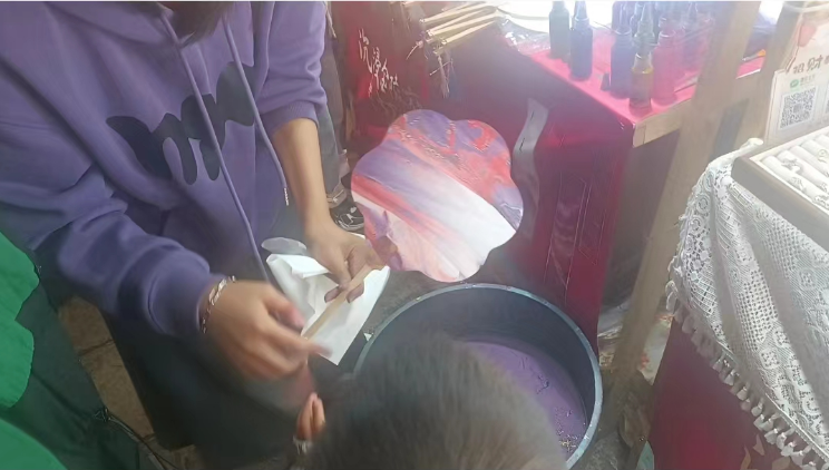 记者看到,摊位上有几十把空白宣纸团扇。一个孩子先挑好了两种喜爱的漆料颜色,摊主将这两种漆料滴入旁边装着水的桶中。由于漆料不溶于水,因此在水面上自然扩散形成独特图案。摊主拿着木棍将水中的颜料轻轻搅开,然后握着小孩的手,拿扇面浸入水中,左右摇晃、轻微旋转,再拿出来时,扇面上已出现浑然天成、色彩绚丽的图案,如山水云雾,又如现代抽象画。等待自动晾干后,再盖上“金陵”或“南京”图章。“不知道会变成什么图案,就像开盲盒一样,好神奇啊。”孩子母亲连连赞叹。