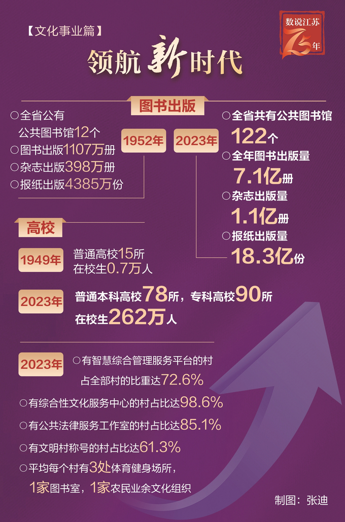 1952年,江苏全省公有公共图书馆仅12座,图书出版1107万册,杂志398万册,报纸4385万份;2023年,江苏的文化事业已蔚然成林,全省公共图书馆数量增至122个,图书出版量达7.1亿册,杂志出版量1.1亿册,报纸出版量达18.3亿份。75年来,江苏文化实力显著提升。