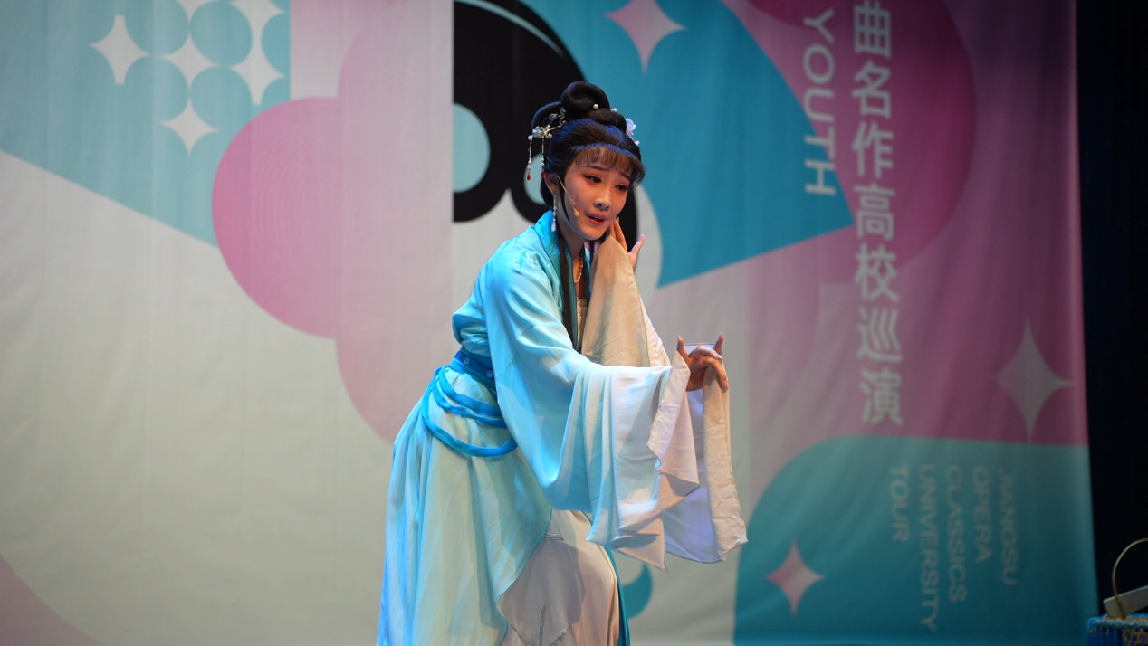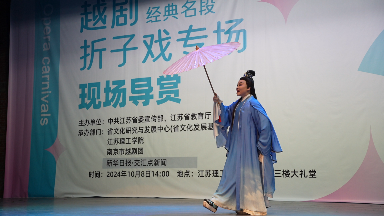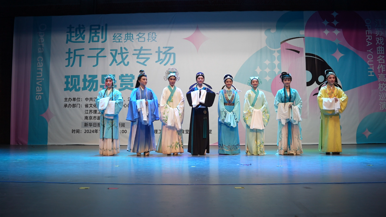交汇点讯 10月8日,婉转悠扬的越剧唱腔回荡在江苏理工学院的校园,一场别开生面的越剧经典名段折子戏专场演出在这里精彩上演。作为2024江苏戏曲名作高校巡演《越剧经典名段折子戏专场》的首场演出,南京市越剧团的青年演员们为学生们奉上了《梁祝·十八相送》《红楼梦・葬花》等六折家喻户晓的越剧名段。精美的舞台布置、细腻的表演,一颦一笑、一唱一和之间,浓郁的江南风韵扑面而来。
