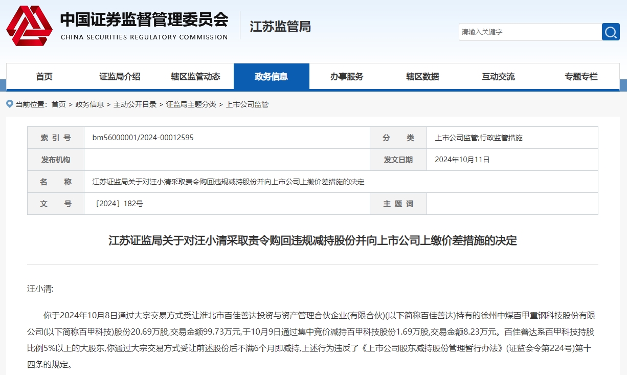 新华日报财经讯 10月11日,江苏证监局发布《关于对汪小清采取责令购回违规减持股份并向上市公司上缴价差措施的决定》。