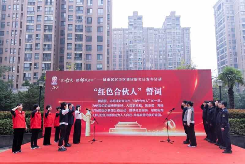 有效整合多方资源,合力打造幸福社区,宜兴市积极打造“红色合伙人”机制,培育了一大批公益慈善、文化娱乐、社区事务、议事协调等类型的社会组织,让更多具有专业能力和奉献精神的志愿者,参与到公益志愿服务中来。此次活动上,志愿者代表、社会组织代表、爱心商铺代表等“红色合伙人”发表了小区共治倡议。为进一步提升服务质量,提高居民主人翁意识,活动当天,宜兴还聘请了一批小区支部观察员、睦邻监督员、邻里调解员。同时,发布了一批“星”物业、“馨”业委会、“心”红色合伙人。