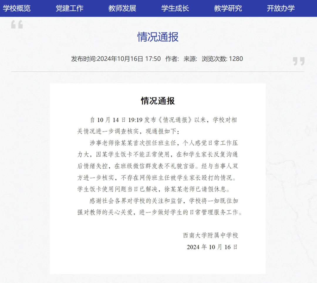 对此,10月16日晚,西南大学附属中学校再次发布情况通报,具体如下: