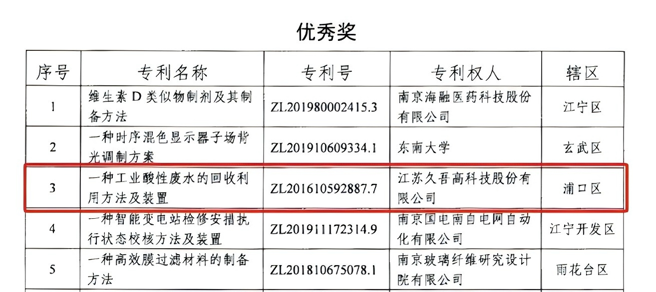 在2023年,久吾高科申报的“一种工业酸性废水的回收利用方法及装置”获得南京市发明专利优秀奖,这个专利的亮点是突破了膜法处理工业酸性废水工艺与装备的关键核心技术,为公司应用于钛白、钢铁、冶金、腐蚀箔、锂电池、矿山排水、制药、染料等行业的膜集成装备产品提供了核心技术支撑。该专利技术经济性好,节能环保(减排)特征显著,具有良好的经济效益和社会效益,属于核心专利。