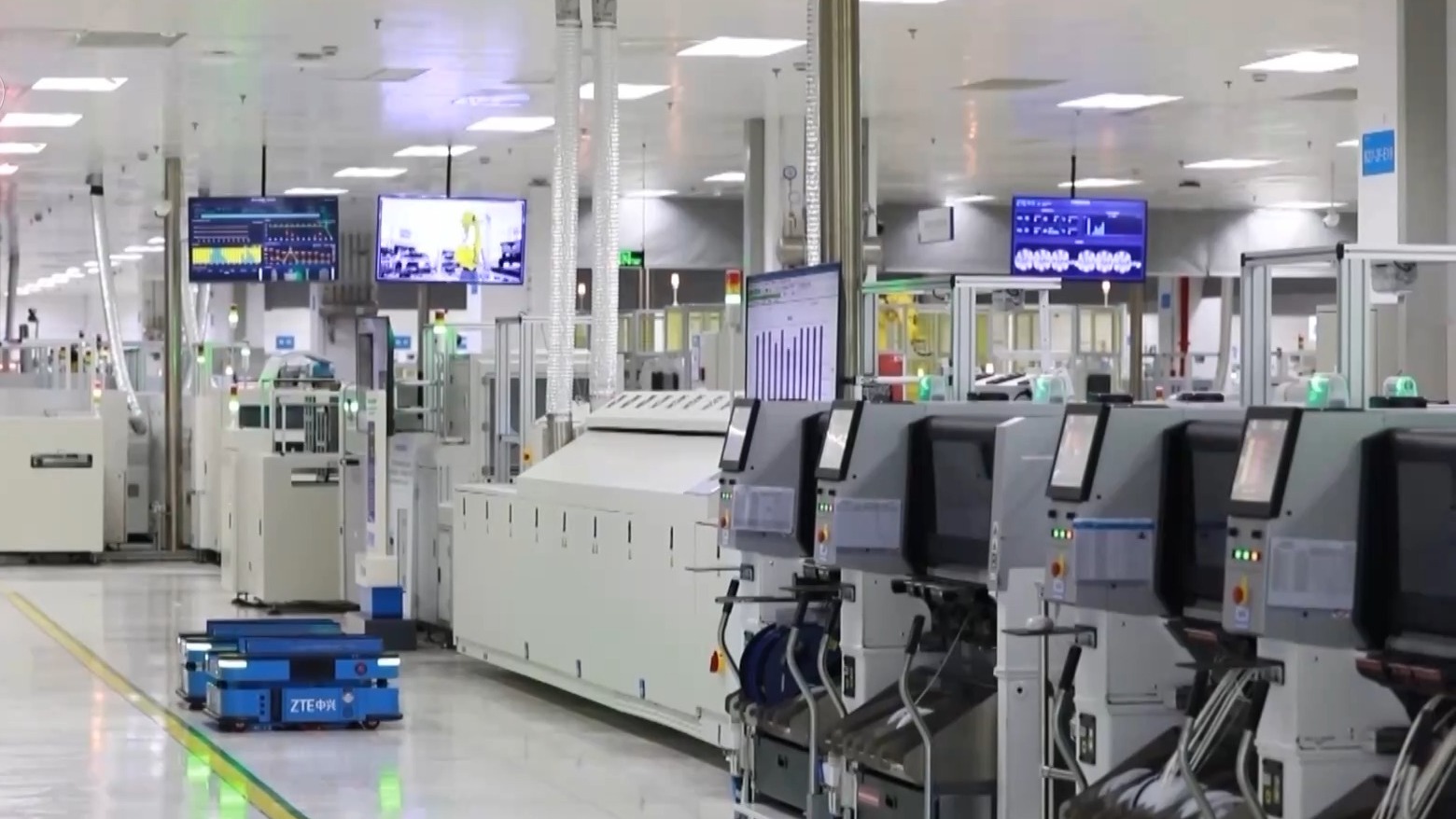 中兴通讯产业数字化部规划总工程师 孟晓斌:滨江工厂已经创新实现了24大类120多个5G创新应用,贯穿了整个生产的全流程。现场的这些设备都是基于5G化的连接,采用了5G的技术去保证了5G基站产品生产的全流程。
