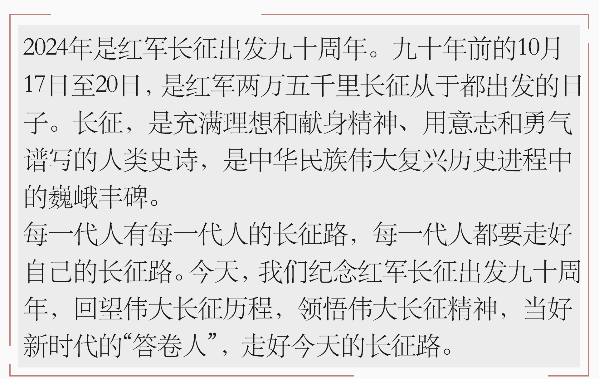 长征的胜利,是中国共产党人理想的胜利,是中国共产党人信念的胜利。在风雨如磐的长征路上,崇高的理想,坚定的信念,激励和指引着红军一路向前。长征这条红飘带,是无数红军的鲜血染成的。艰难可以摧残人的肉体,死亡可以夺走人的生命,但没有任何力量能够动摇中国共产党人的理想信念。