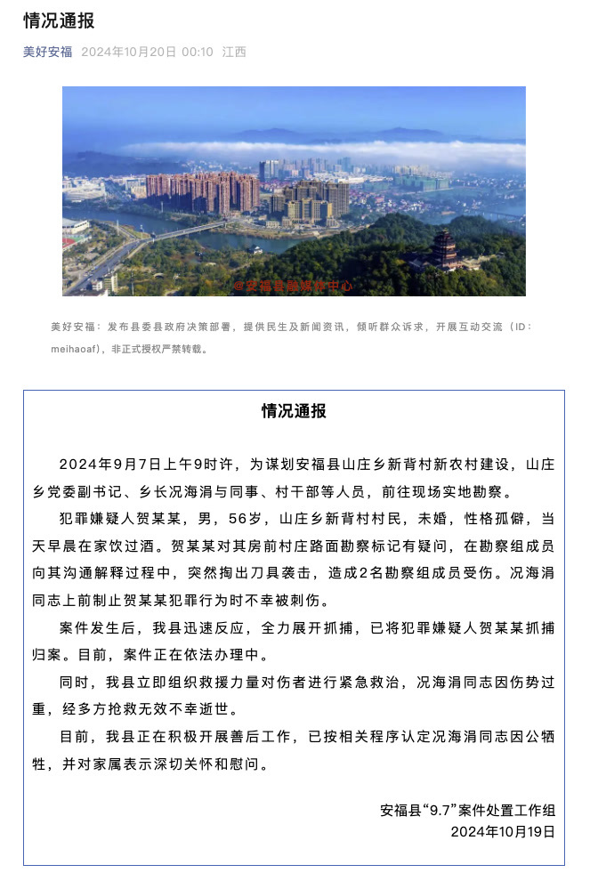 10月20日,江西安福县发布情况通报称,2024年9月7日上午9时许,为谋划安福县山庄乡新背村新农村建设,山庄乡党委副书记、乡长况海涓与同事、村干部等人员,前往现场实地勘察。犯罪嫌疑人贺某某,男,56岁,山庄乡新背村村民,未婚,性格孤僻,当天早晨在家饮过酒。贺某某对其房前村庄路面勘察标记有疑问,在勘察组成员向其沟通解释过程中,突然掏出刀具袭击,造成2名勘察组成员受伤。况海涓同志上前制止贺某某犯罪行为时不幸被刺伤。目前,已将犯罪嫌疑人贺某某抓捕归案。况海涓同志因伤势过重,经多方抢救无效不幸逝世。目前,已按相关程序认定况海涓同志因公牺牲,并对家属表示深切关怀和慰问。