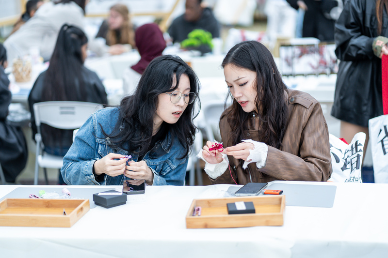 江苏大学研三学生钱佳颖和同学专程从镇江赶来参加活动,10月19日当天,她们在逛展的同时,还报名参加了扬州通草花小夜灯和南京盘扣胸针两项体验工坊。“我们是艺术设计专业的学生,平时我们就有关于非遗的课程,我们接触过掐丝珐琅、香包等技艺,对非遗技艺比较感兴趣,自己也会做一些小物件,所以这次毫不犹豫报名参加了活动。”