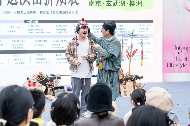 从扬剧、锡剧等江苏特色传统戏剧,到古彩戏法、木偶剧、小丑剧等引人入胜的精彩表演……一项项融合非遗的传统表演,经过传承人的创新发展,被依次搬上了“非遗生活荟”的舞台。目不暇接的演出,吸引了不少观众驻足观看,连连鼓掌,还有不少观众跃跃欲试,与表演者们互动,体会戏剧里的非遗魅力。