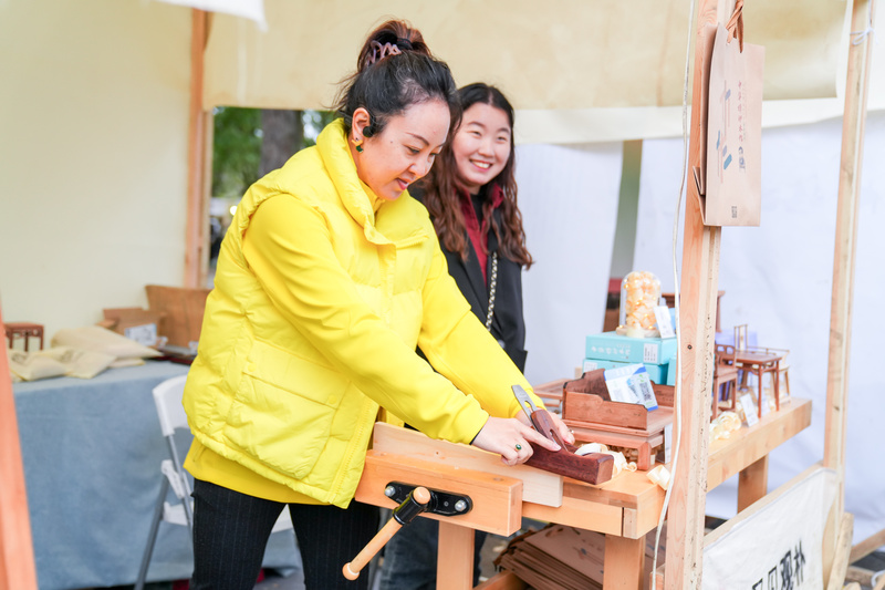精细木作是国家级非遗传承项目。现场,观众可以体验榫卯拼装的乐趣。人们惊叹于古代匠人如何不用一颗钉子,仅凭木材之间的凹凸结构,就能稳固地将木件拼装在一起。来动手体验的观众络绎不绝,他们还好奇地体验起传统木工工具——刨子的使用,与传统木作零距离接触。