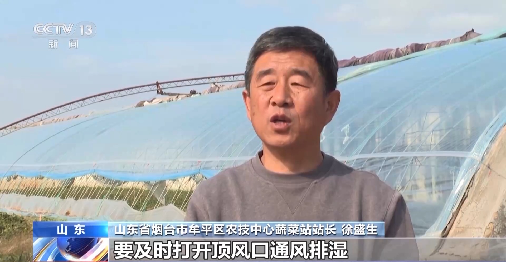 山东省烟台市牟平区农技中心蔬菜站站长 徐盛生:大棚里面湿度都比较大,容易滋生病虫害,要及时打开顶风口,通风排湿,保证肥水供应,使蔬菜能够提高产量。