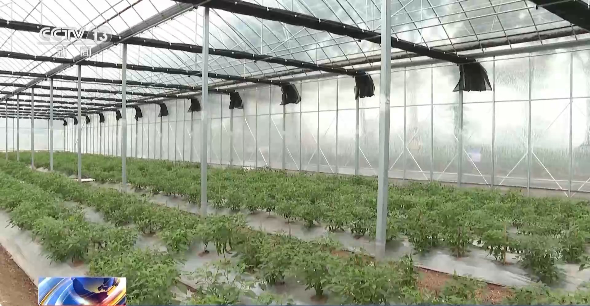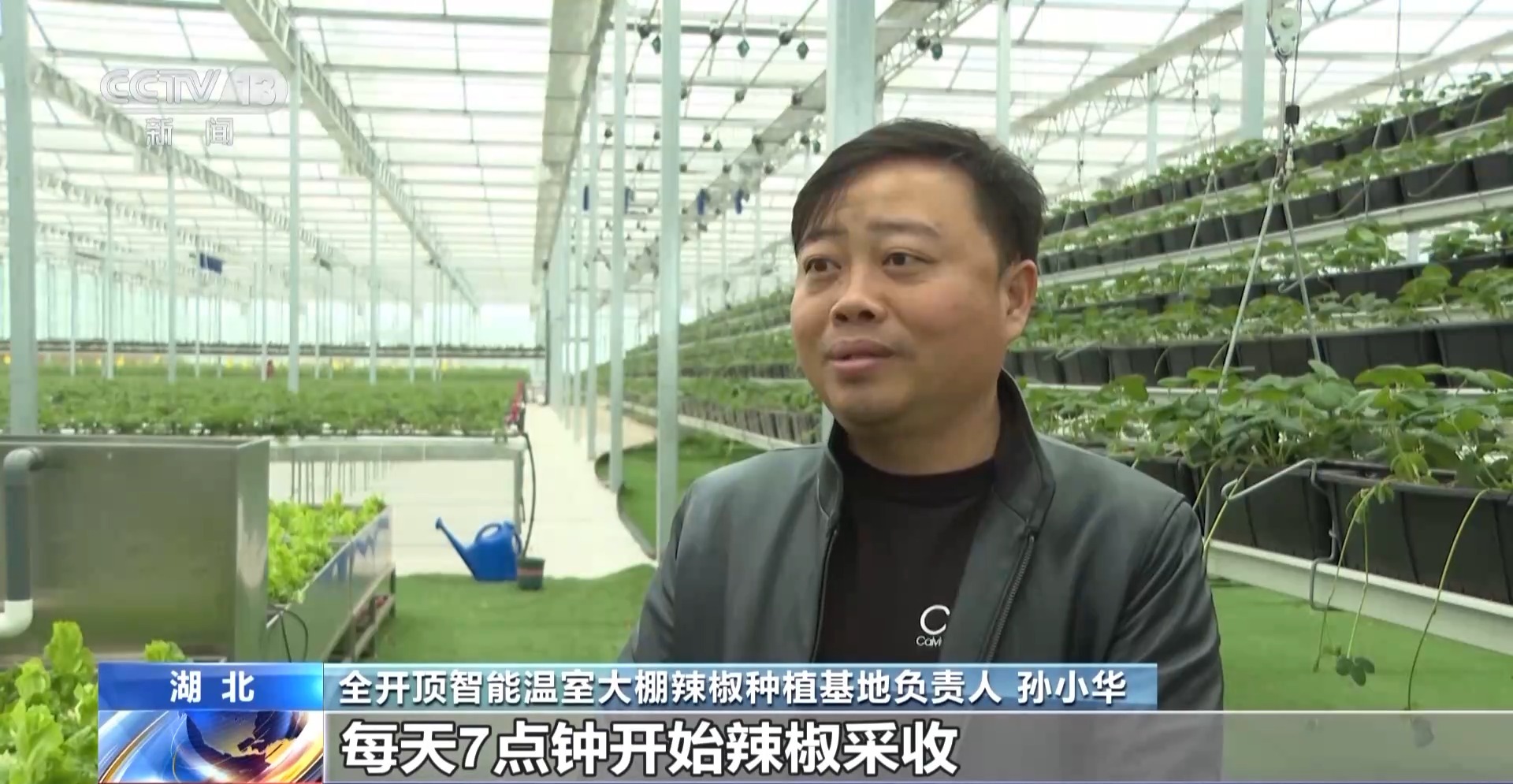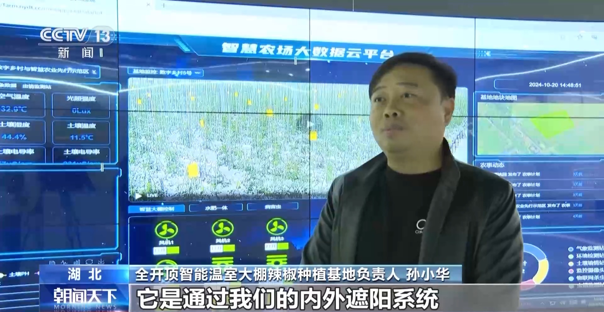 全开顶智能温室大棚辣椒种植基地负责人 孙小华:湿度、温度和光照强度,它是通过我们的内外遮阳系统、侧开窗系统以及顶开窗系统,加上风机和湿帘,共同联动智能控制棚内温度;虫情监测系统能智能判断,针对性防范。