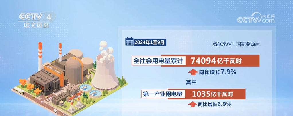 数据显示,今年1至9月,全社会用电量累计74094亿千瓦时,同比增长7.9%。其中,第一产业用电量1035亿千瓦时,同比增长6.9%;第二产业用电量47385亿千瓦时,同比增长5.9%;第三产业用电量13953亿千瓦时,同比增长11.2%;城乡居民生活用电量11721亿千瓦时,同比增长12.6%。