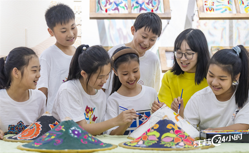 (特约摄影 翟伟凯 14:02摄 18:40上线)10月22日,海安市城南实验小学的学生在老师指导下,在斗笠上画传统纹样。近期,该校开设“纹样密码工作坊”,让学生在创作实践中,感受传统文化的魅力。