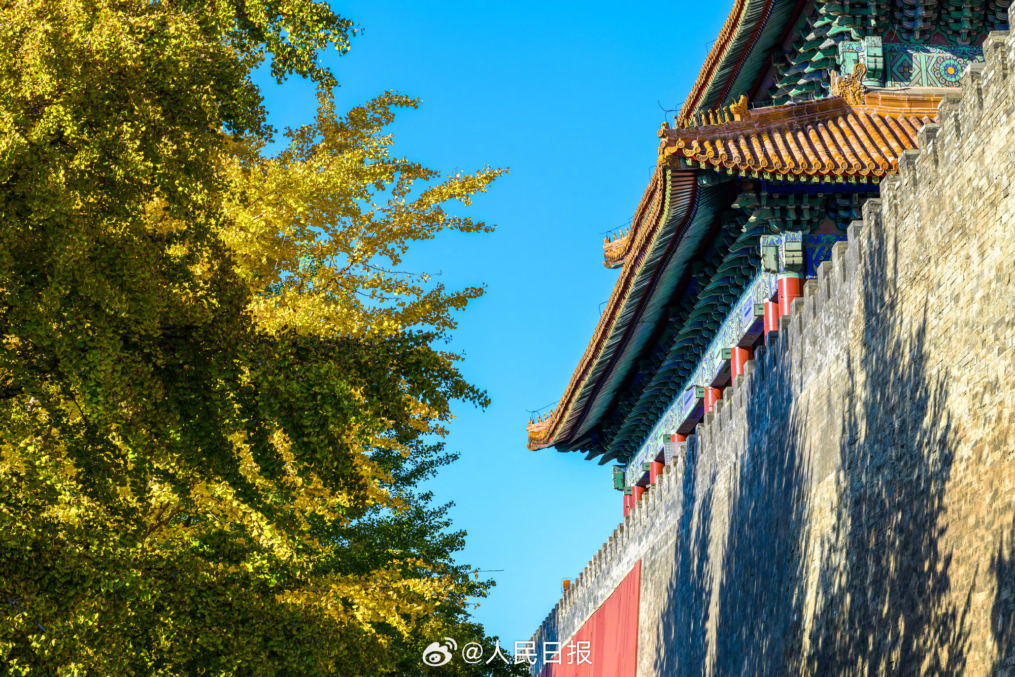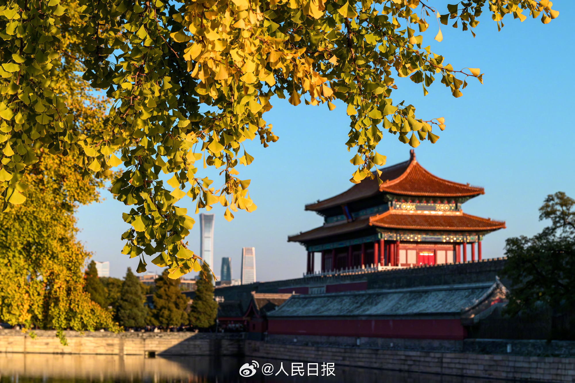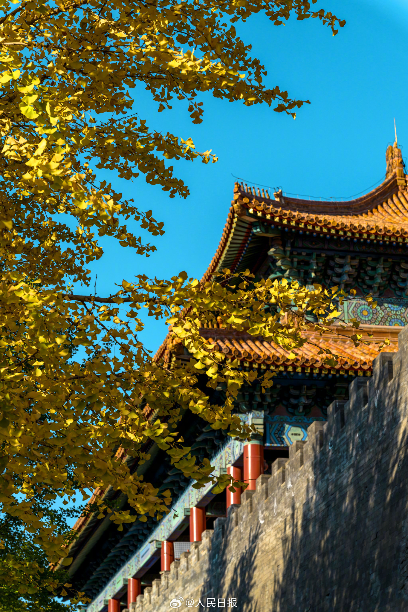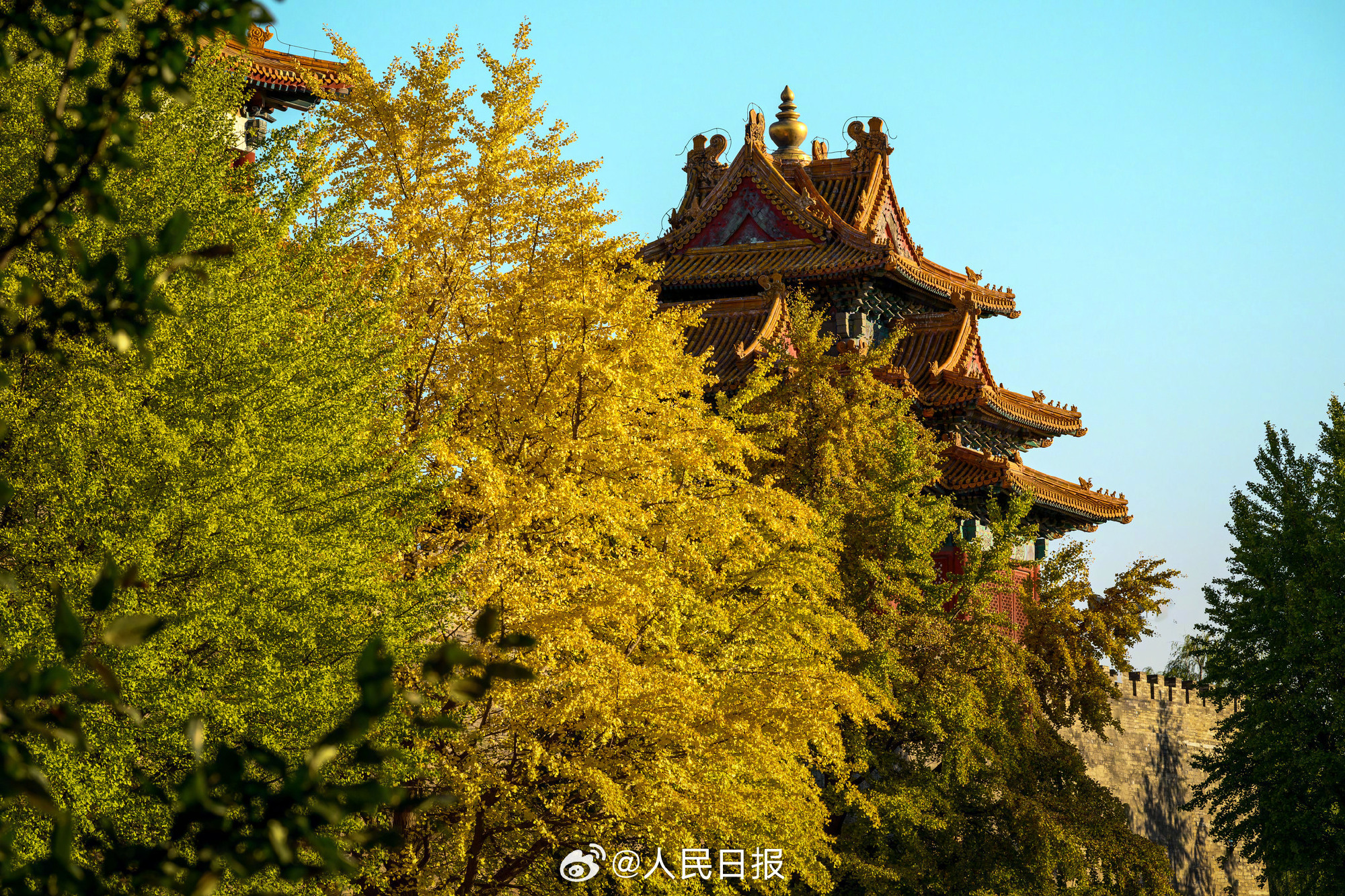10月22日,北京,故宫角楼周边的银杏树叶变黄。秋意满满,故宫角楼与金黄银杏同框。