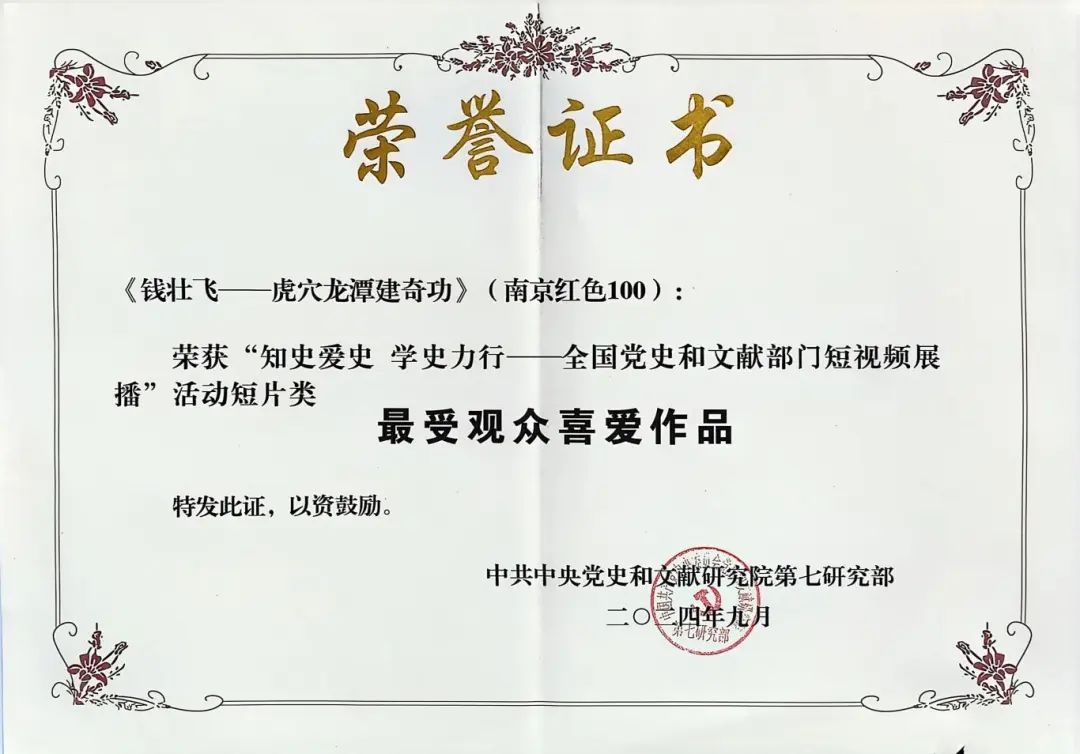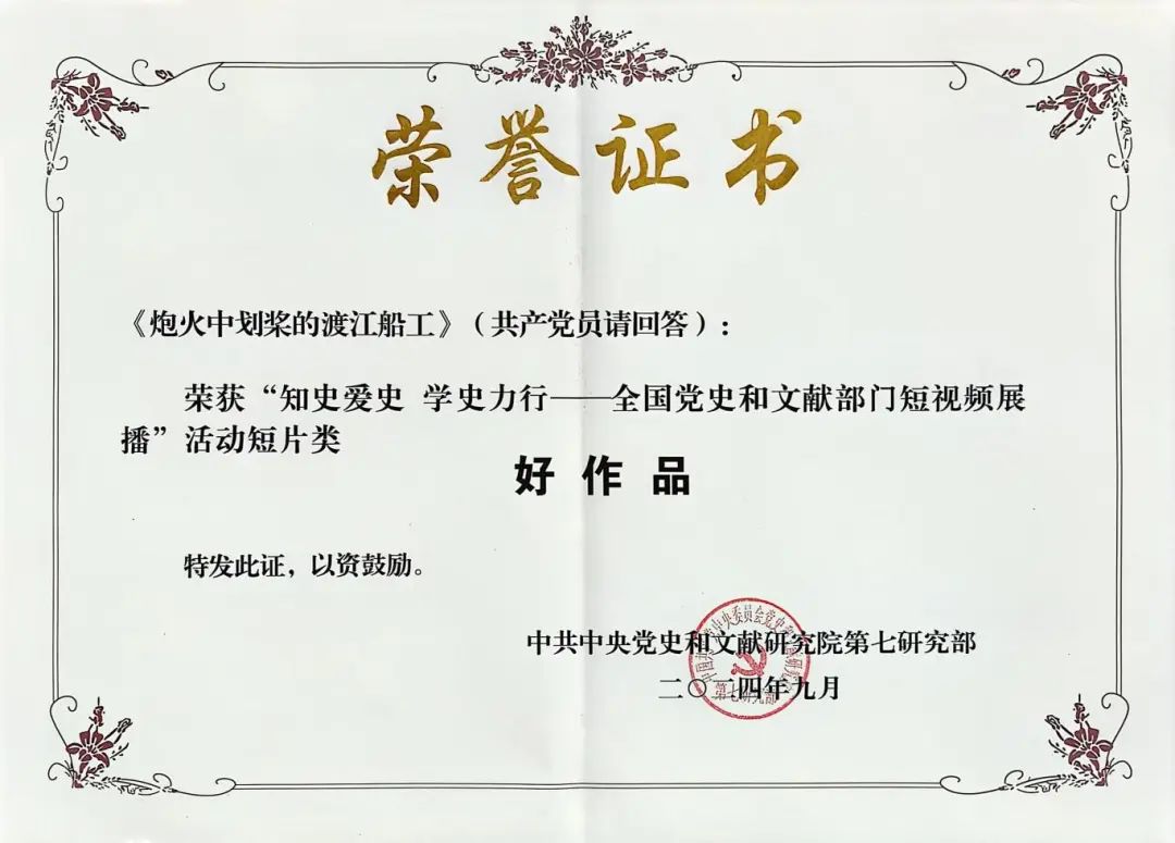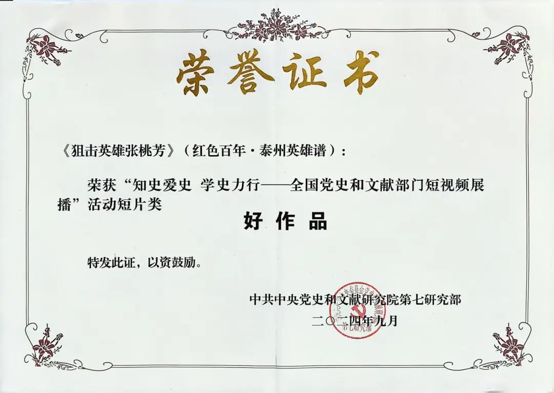 近日,中央党史和文献研究院公布“知史爱史 学史力行——全国党史和文献部门短视频展播”活动结果,我省报送的7部作品入选,其中:《张太雷:谋将来永远幸福》《钱壮飞——龙潭虎穴建奇功》荣获短片类“最受观众喜爱作品”,《无名英雄 家国永念》《狙击英雄张桃芳》《炮火中划桨的渡江船工》荣获短片类“好作品”,《向往的生活》荣获讲述类“好作品”,《苏州抗战老兵口述史——叶国清》荣获讲述类“入选作品”。