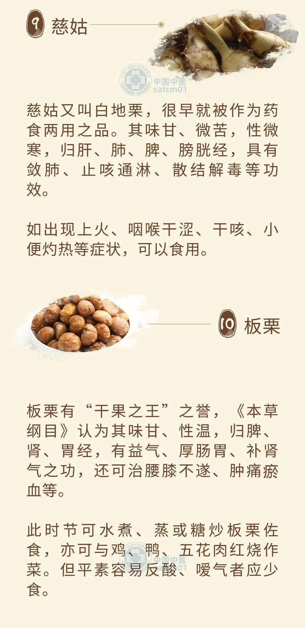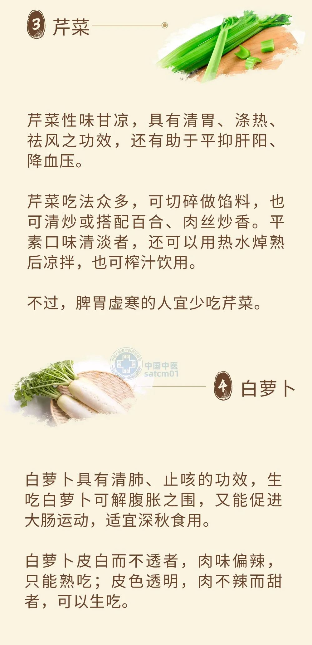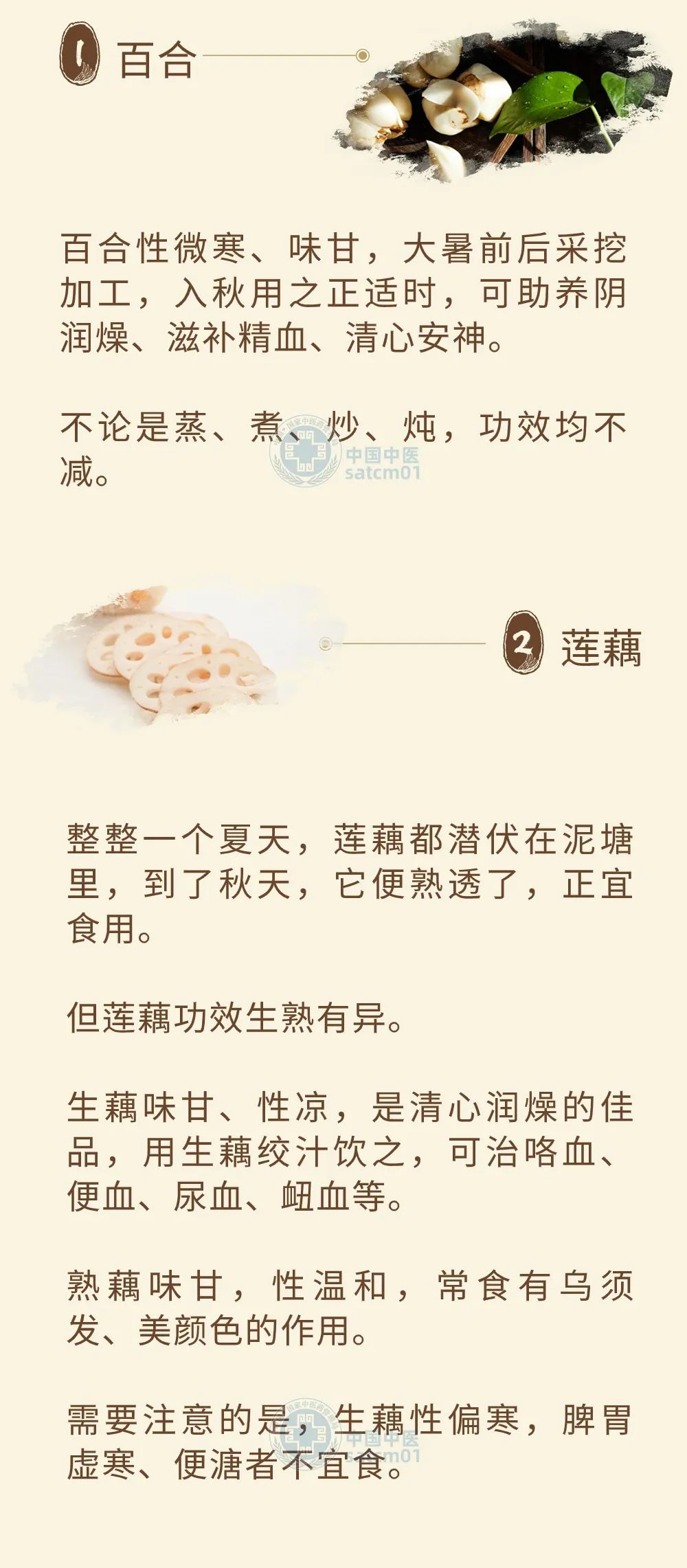 在中医理论中,秋季对应五行为金,五脏为肺,五色为白。金性刚强,冷硬肃杀,秋气主燥。所以,在秋季食疗中,食材应具有少辛、微酸、滋阴、润燥的性质。下列这十种素食就是不错的选择,大家可酌情选择——