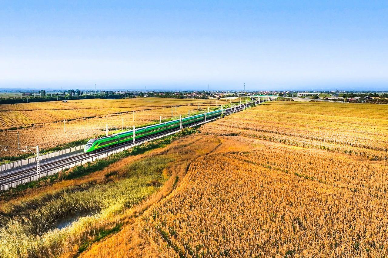 △金色的田野上,复兴号动车组列车飞驰而过。孟浩 摄
