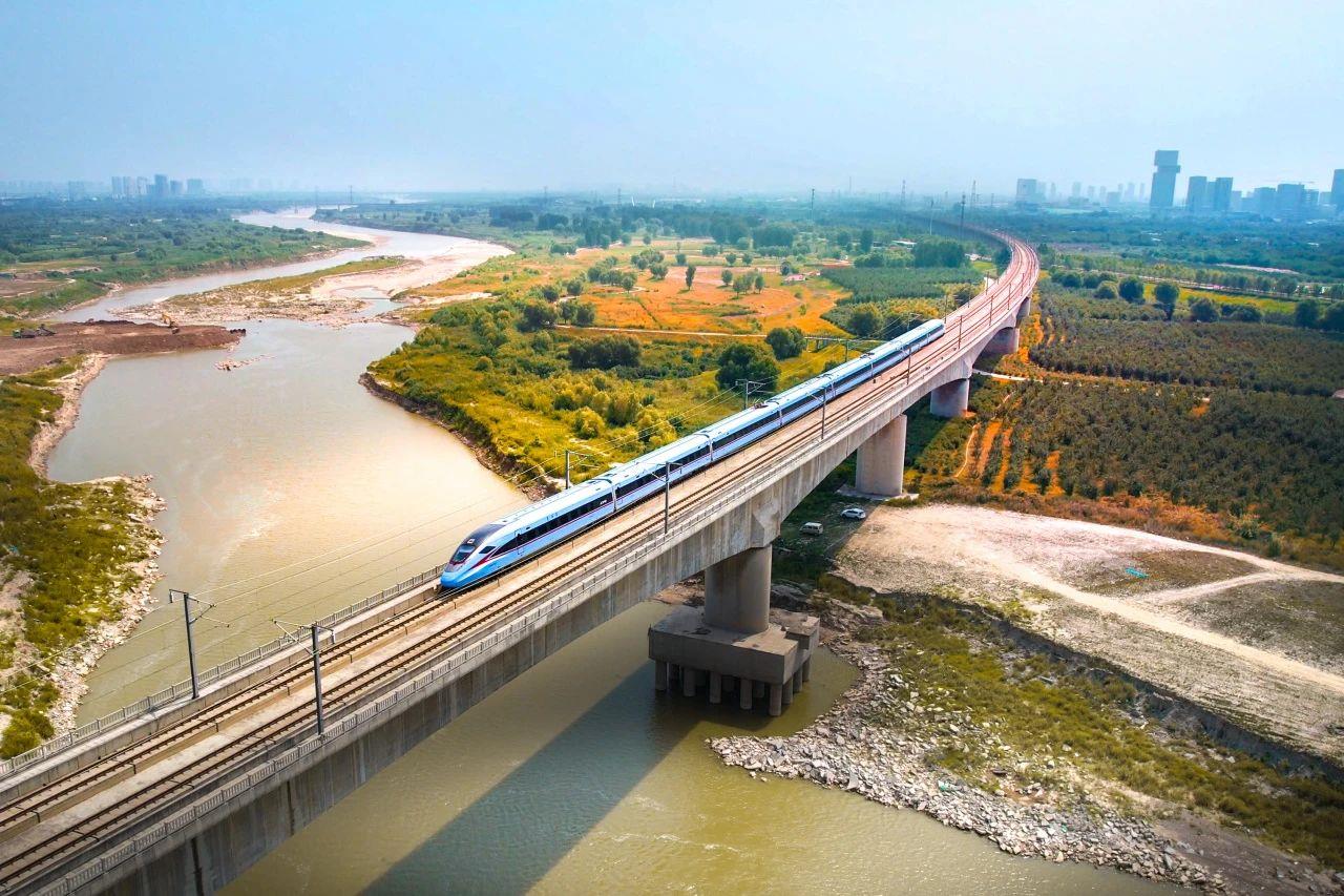 △复兴号动车组列车行驶在徐兰高铁咸阳渭河特大桥上。石洁 摄