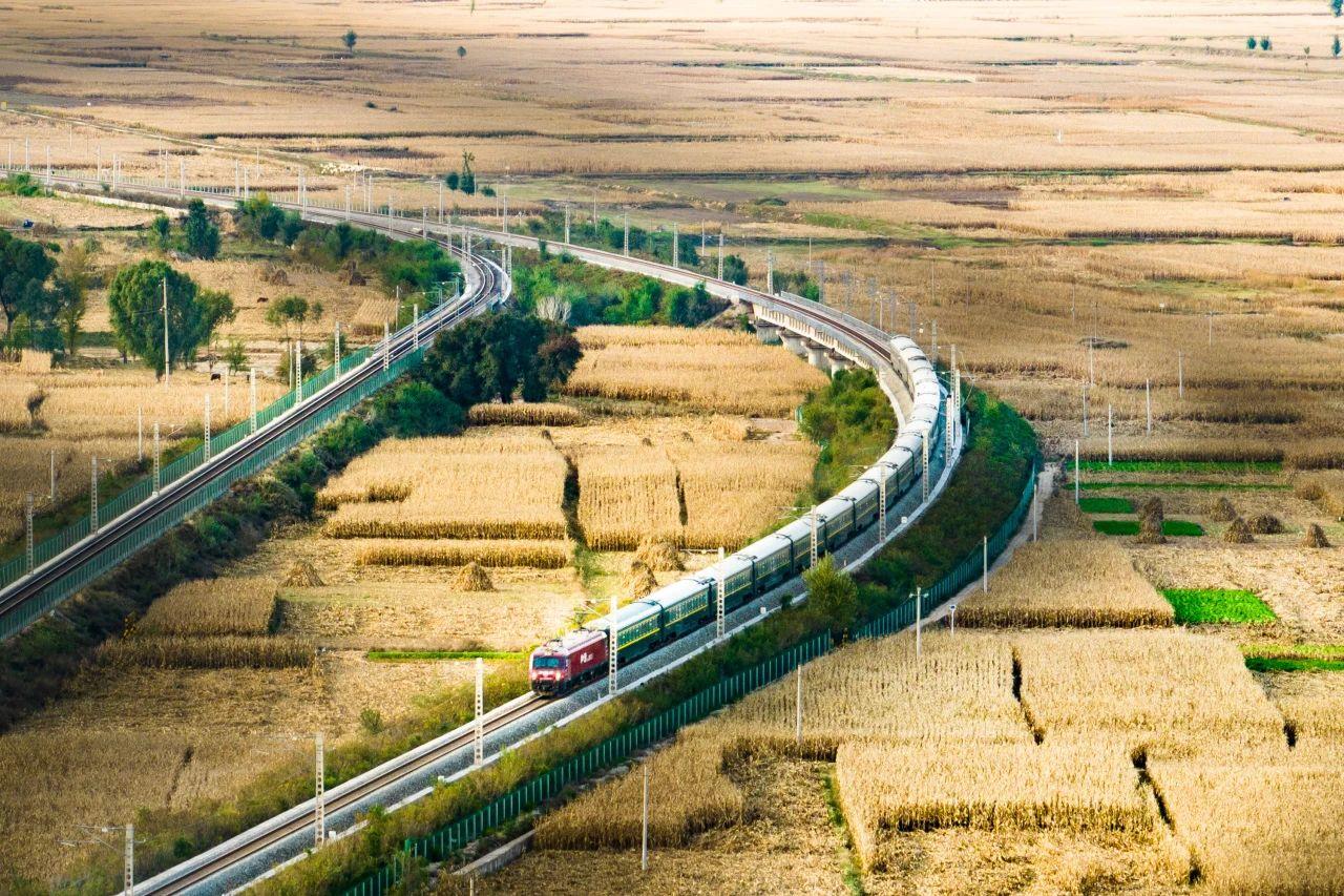 △旅客列车行驶在包西铁路上,穿过一片金灿灿的田野。郭建伟 摄