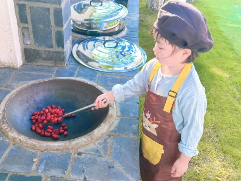活动在舞龙舞狮的热闹氛围中拉开序幕。紧接着,朱镇长和唐园长先后上台致辞,随后,幼儿代表、朱镇长和唐园长共同为开灶仪式剪彩。幼儿书写或涂鸦福字,并将这些充满祝福的福字贴在户外厨房。随后,幼儿们手拎着芹菜、南瓜、玉米等,依次进场,展现出了他们对活动的无限热情和期待。中二班幼儿也挑着柴捆进场,为接下来的烹饪活动做好准备。幼儿们用稻草引燃火源,开始了烹饪过程。他们先蒸煮山芋、南瓜、玉米等食物,幼儿与教师一起洗菜、切菜,与食堂阿姨一起炒制了红枣、栗子、花生以及地三鲜等美味佳肴。