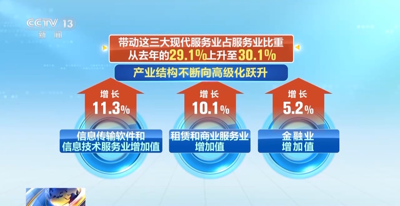 产业结构持续升级。前三季度,装备制造业增加值占全部规模以上工业的比重达33.8%,已连续19个月保持在30%以上。信息传输软件和信息技术服务业、租赁和商业服务业、金融业增加值分别以11.3%、10.1%和5.2%的速度快速增长,带动这三大现代服务业占服务业比重从去年的29.1%上升至30.1%,产业结构不断向高级化跃升。