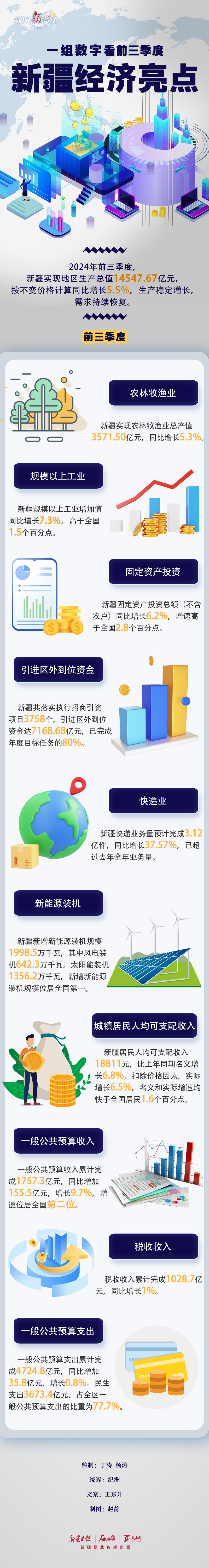 GDP同比增长5.5%,规模以上工业增加值同比增长7.3%,固定资产投资总额(不含农户)同比增长6.2%,居民人均可支配收入实际增长6.5%……前三季度,新疆经济发展得怎么样?有何亮点?一起来了解。