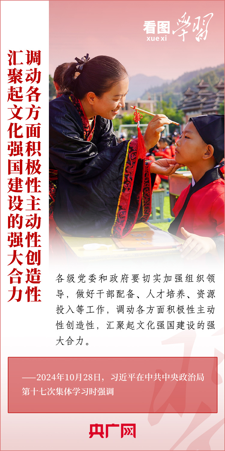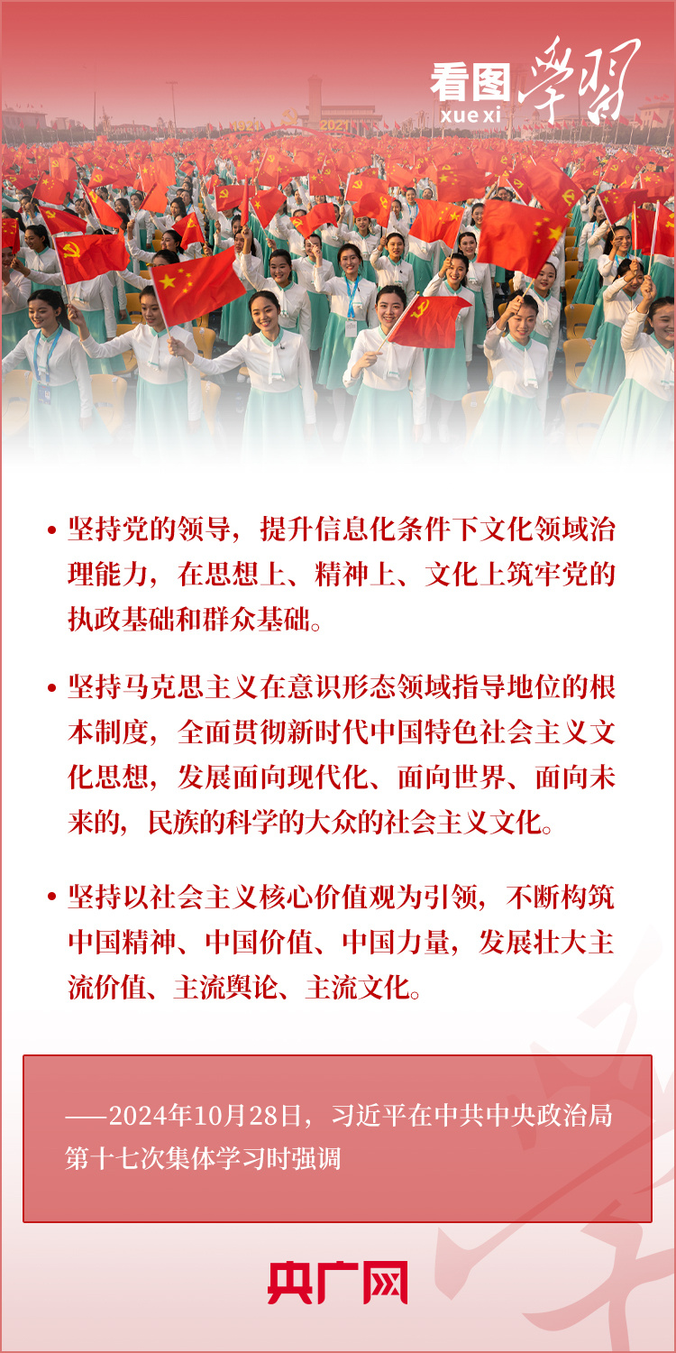 建设文化强国是全党全社会的共同任务。10月28日,中共中央政治局就建设文化强国进行第十七次集体学习。习近平总书记在听取讲解和讨论后发表重要讲话,就锚定2035年建成文化强国战略目标作出最新部署,强调要“不断发展具有强大思想引领力、精神凝聚力、价值感召力、国际影响力的新时代中国特色社会主义文化,不断增强人民精神力量,筑牢强国建设、民族复兴的文化根基。”一起来学习!