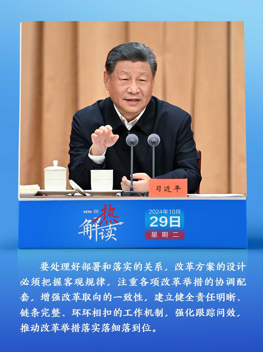 热解读 10月29日,省部级主要领导干部学习贯彻党的二十届三中全会精神专题研讨班开班。在开班式上,习近平总书记明确提出要“处理好部署和落实的关系”,“建立健全责任明晰、链条完整、环环相扣的工作机制,强化跟踪问效,推动改革举措落实落细落到位”。