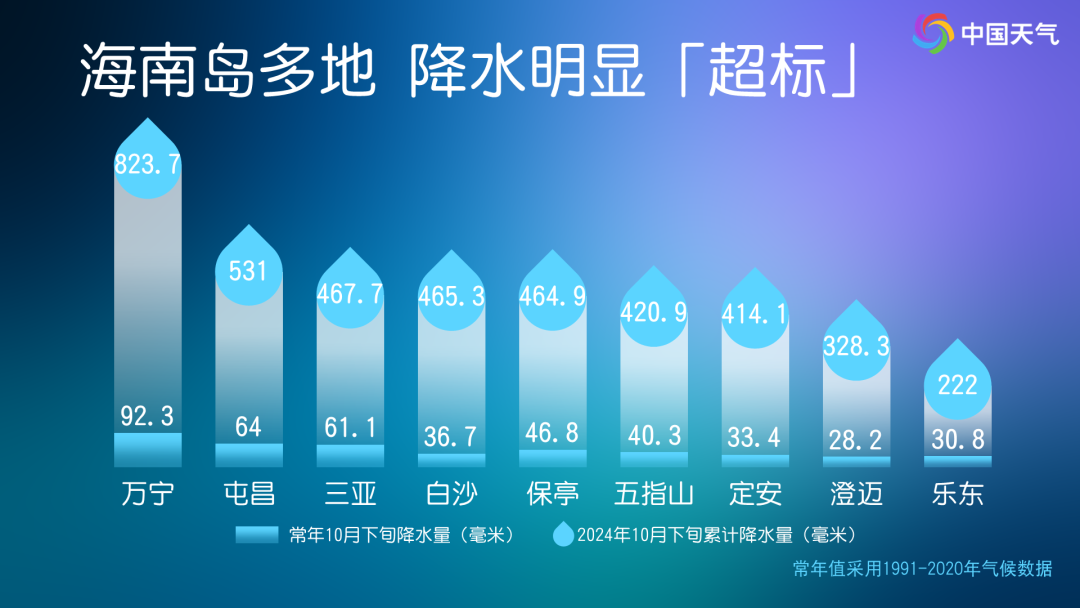 重点关注海南岛,刚刚过去的10月下旬,海南岛一带降雨已经大幅偏多于常年同期,这次强降雨过程要特别防范降雨叠加带来的次生灾害。