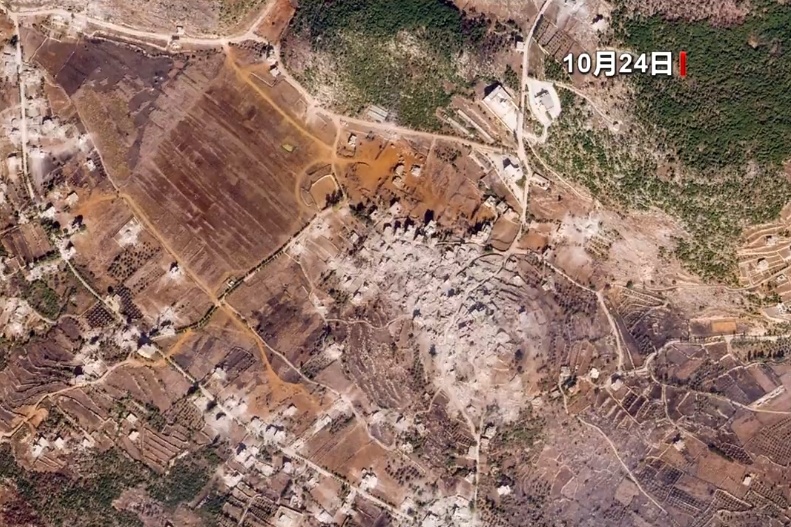 以军与黎巴嫩真主党的冲突导致黎巴嫩边境地区遭受严重破坏。美联社11月2日公布的卫星图片显示,黎以临时边界附近黎巴嫩一侧的多个村庄在近一个月的时间里被夷为平地。