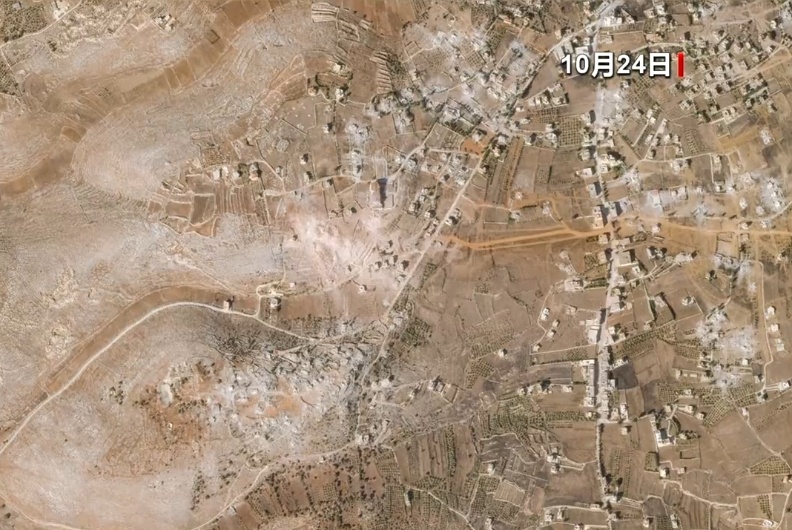 9月26日拍摄的卫星图像显示这些村庄遍布房屋和植被,而在10月24日拍摄的卫星图像中,这些村庄都已经成为废墟。
