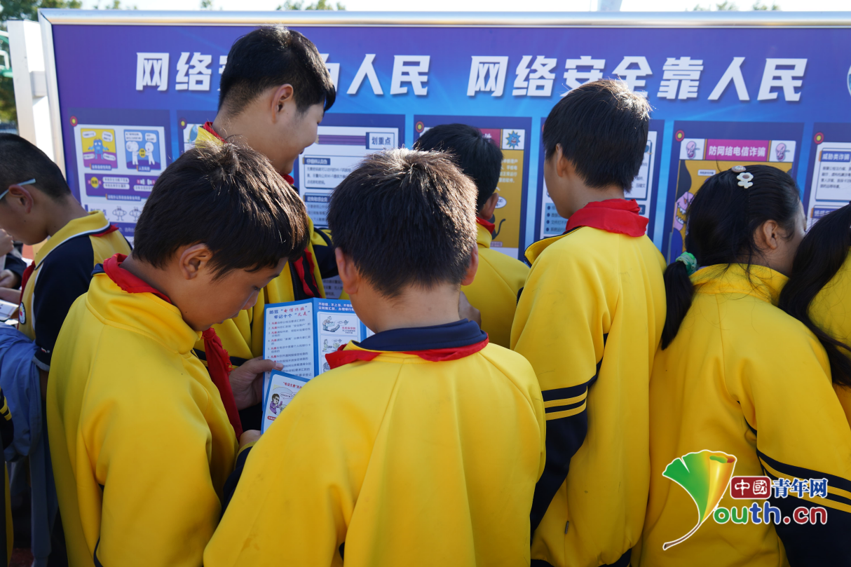 学生们在普法展板前学习交流。中国青年网记者 田昕禾摄