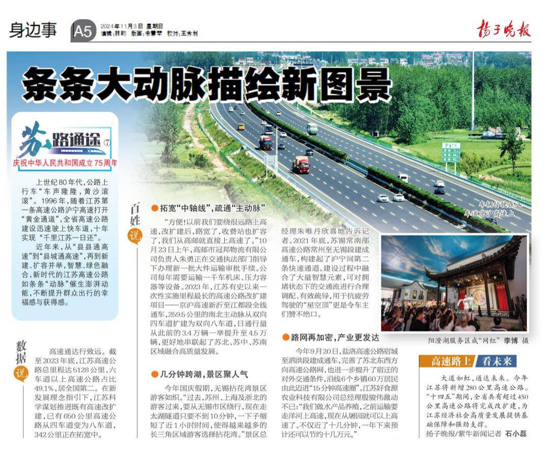 “方便!以前我们要绕很远路上高速,改扩建后,路宽了,收费站也扩容了,我们从高邮就直接上高速了。”10月23日上午,高邮市冠邦物流有限公司负责人朱勇正在京沪高速交通执法部门指导下办理新一批大件运输审批手续。公司每年需要运输一千车机床、压力容器等设备。2023年,江苏有史以来一次性实施里程最长的高速公路改扩建项目——京沪高速新沂至江都段全线通车,259.5公里的南北主动脉从双向四车道扩建为双向八车道,日通行量从此前的3.4万辆一举提升至4.5万辆,更好地串联起了苏北、苏中、苏南区域融合高质量发展。