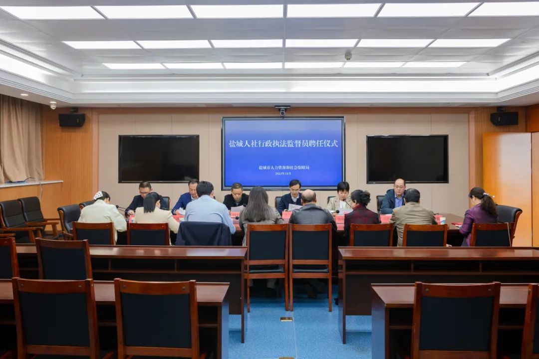 在聘任仪式上,盐城市人社局向特聘监督员介绍了该局的行政执法工作。近年来,盐城市人社部门以扎实推进行政执法三项制度为抓手,健全执法机制,规范执法流程,提升执法质效。在强练内功的同时,自觉接受外部监督,持续加强行政执法规范化建设。盐城市工伤预防工作被评为全省“法治人社”建设创新案例,市劳动监察支队被省政府表彰为全省优秀农民工工作先进集体,市人社局被人社部、国家市场监管总局表彰为清理整顿人力资源市场秩序“突出成绩单位”,盐城市连续三年跻身保障农民工工资支付工作“A”类城市。