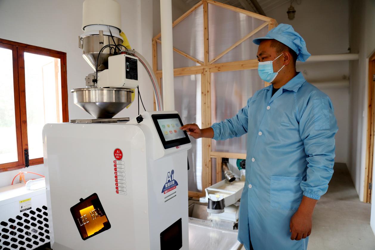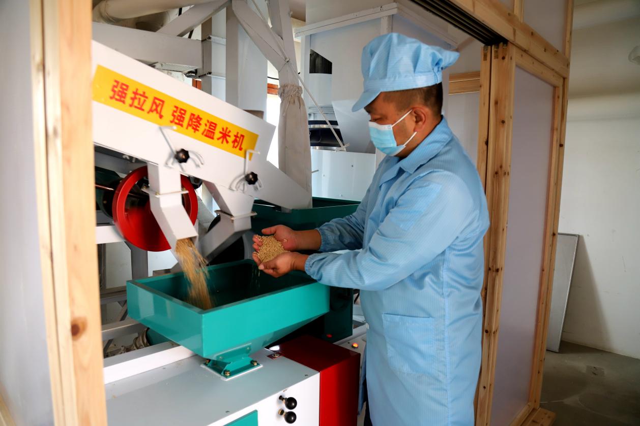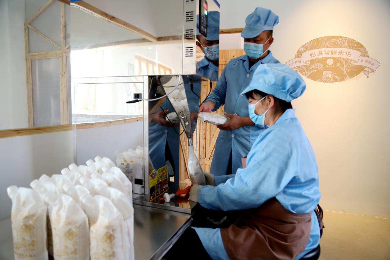 11月4日,在高淳区桠溪街道永尚村归来兮有机庄园生产车间内,工人们正在生产加工包装有机红花鲜米准备销往市场。