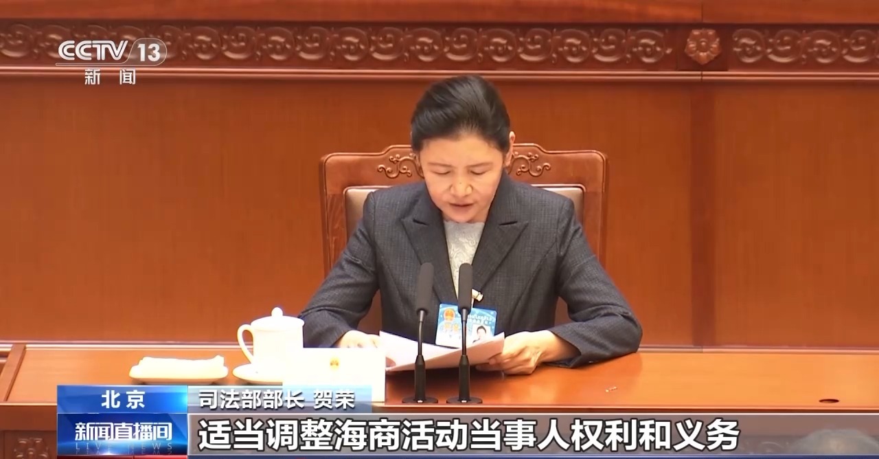司法部部长 贺荣:适当调整海商活动当事人的权利和义务。合理配置责任和风险,促进形成更加明确稳定的市场预期,主要包括强化海上货物运输承运人责任,加大旅客权益的保护力度,适当提高海事赔偿责任限额,适当调整海上保险合同当事人的权利和义务等。