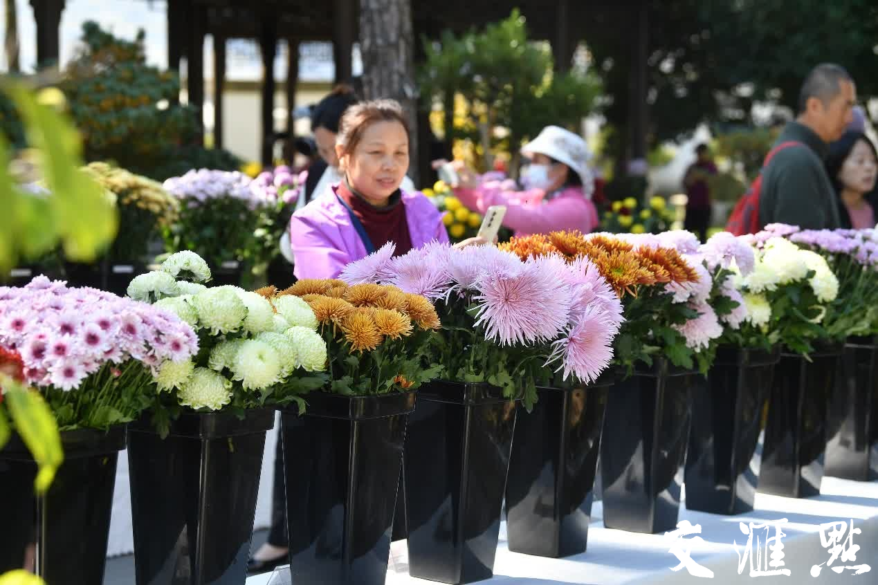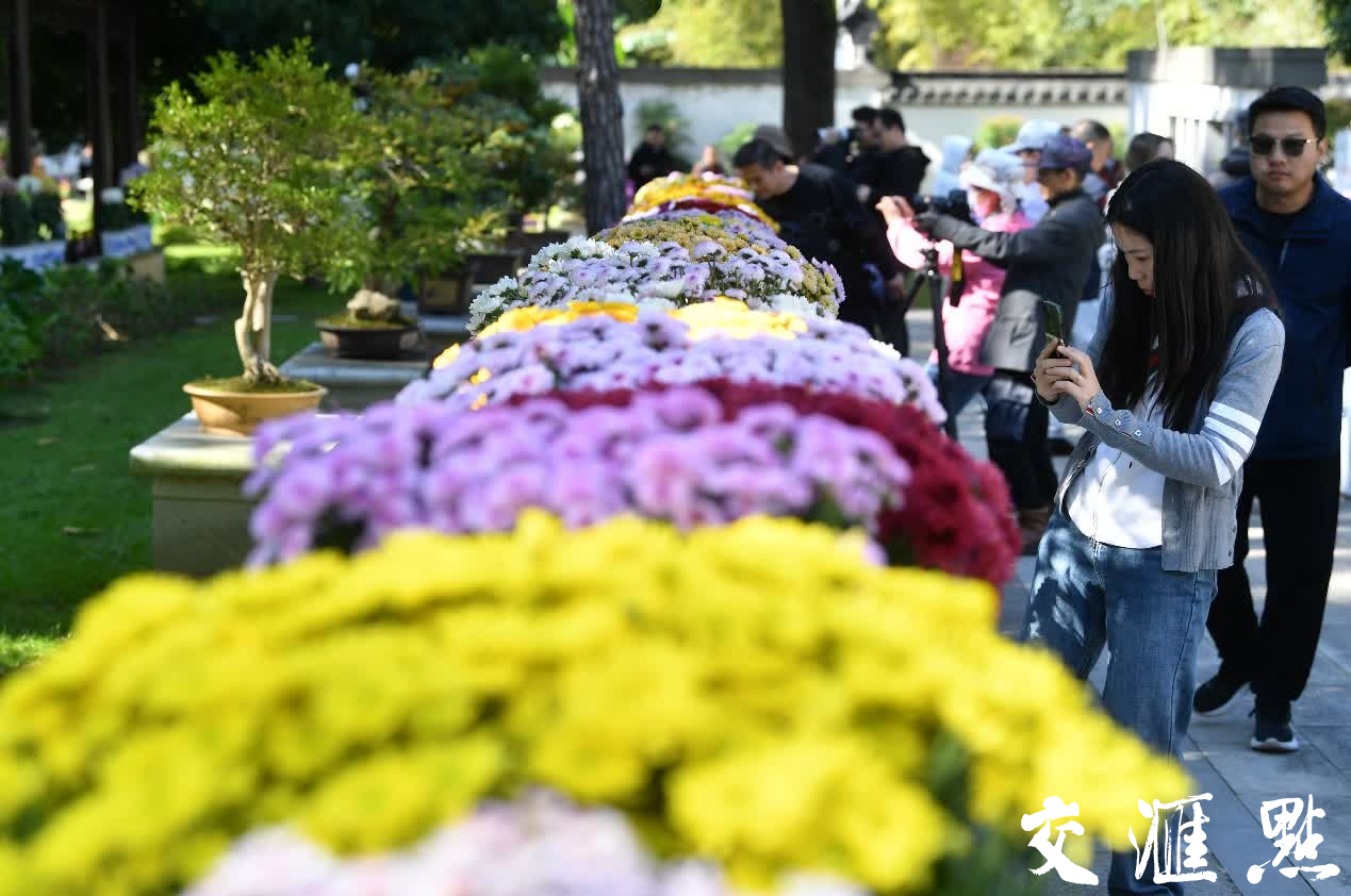 新华日报·交汇点记者在现场看到,淡黄、明黄、金黄,紫红、橙红、深红等各色菊花错落有致地摆在一起,让人瞬间置身于陶渊明笔下“采菊东篱下,悠然见南山”的超脱而宁静的意境之中。