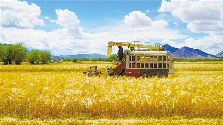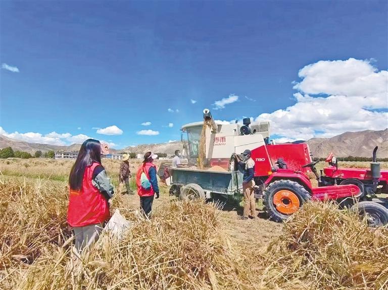 在白朗县巴扎乡,沿着国道两边一幅金黄色的高原“丰收”画卷徐徐铺展开来。在巴扎乡金嘎村,县农牧综合服务中心的旦增这两天也把办公室搬到了田间地头,指导当地群众的秋收工作。“在三秋开展之前,我们组织农机合作社的农户进行农机具维修保养工作,并对成熟区域采取了成熟一片收割一片的收割方式,今年全县粮食播种面积12.74万亩,预计粮食产量持续稳定在5万吨以上。”旦增介绍道。