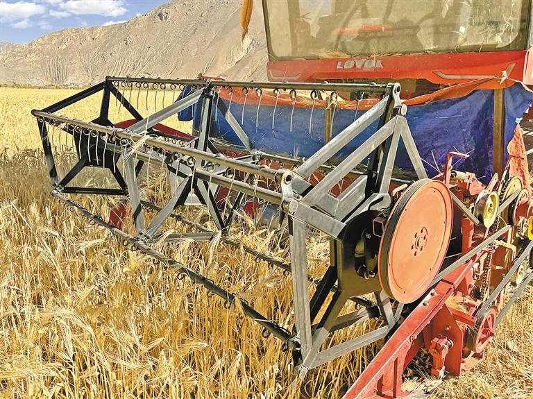 收割机在江孜青稞田里作业。通讯员 代旭 摄