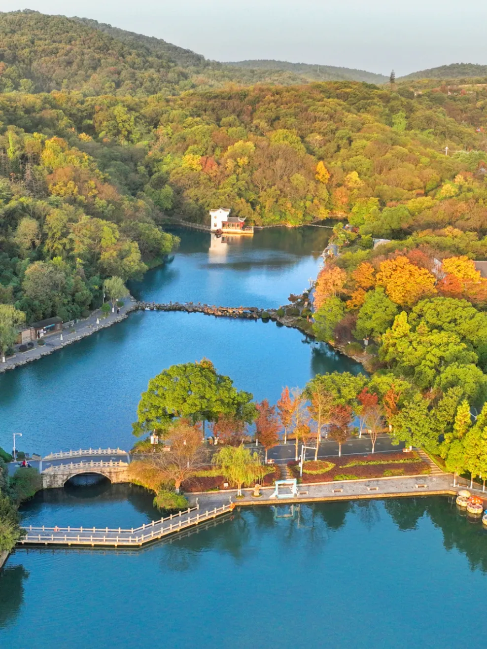 佛手湖面积广阔,湖水在晚秋的微风中波光粼粼。湖边的树木换上了秋装,金黄的树叶倒映在湖水中,美如画卷。