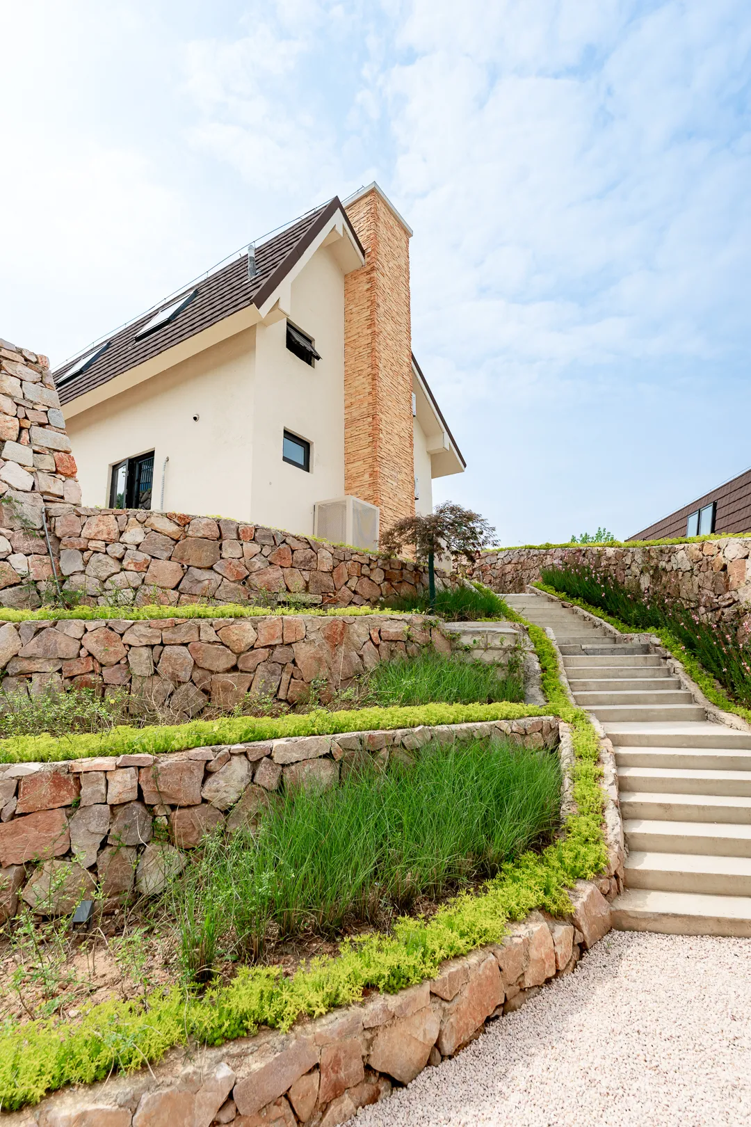 村里的茅草屋和现代简约的白色小屋隔空对望,别有一番风味。