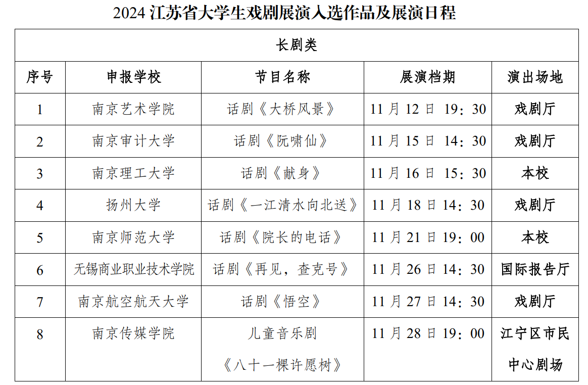 2024年度江苏省大学生戏剧展演在总结数年经验的基础上推出创新举措,将征集作品按专业和非专业进行分组评选,大大激励了广大非艺术类专业院校的参与积极性。据悉,今年全省共有62所高校申报了96部作品,其中长剧11部、短剧75部、戏曲10部。